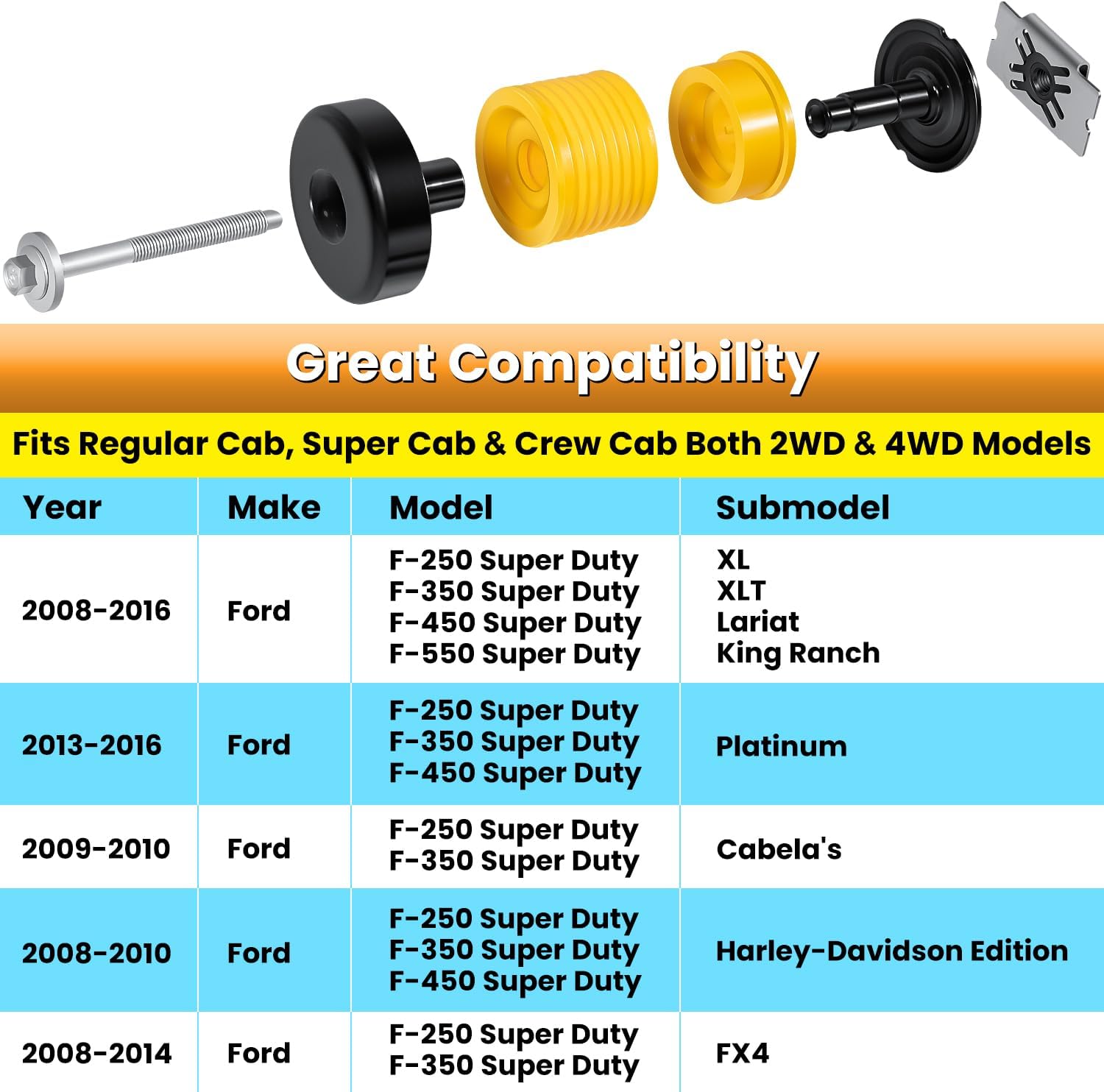 Great Compatibility — Perfectly fit for 2008-2016 Ford F250 F350 F450 F550 Super Duty 2WD and 4WD XL, XLT, FX4, Lariat, King Ranch, Platinum, Cabela's, Harley-Davidson Edition. Fits Regular Cab, Super Cab and Crew Cab Models for Body Position 2, 3, 4. Each part is manufactured to OEM specifications and precision-engineered to be a direct replacement for factory mounts, bolts and hardware.