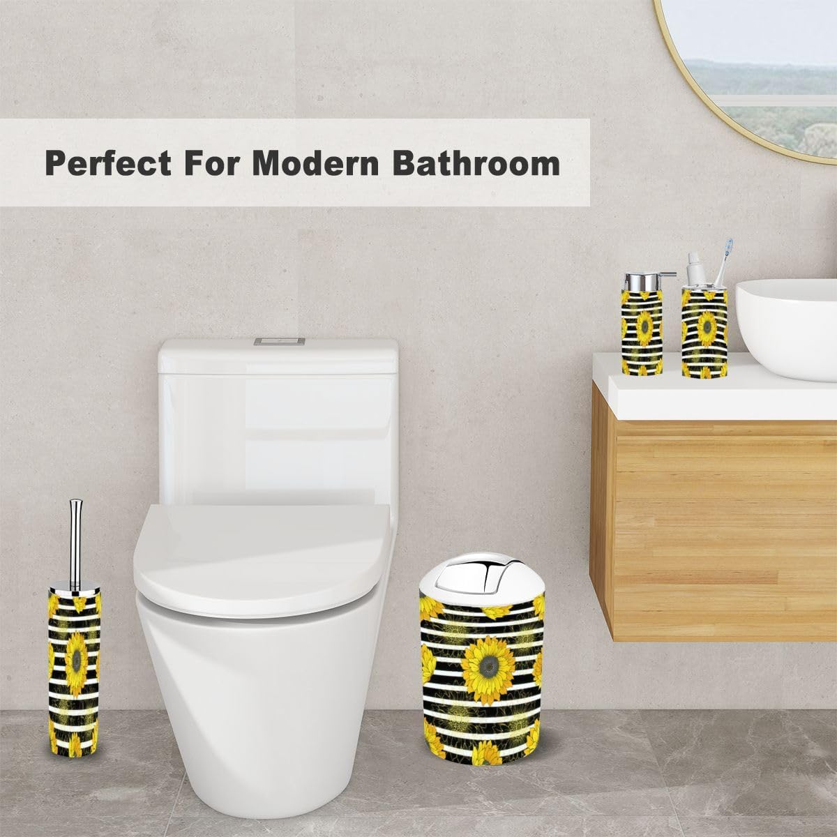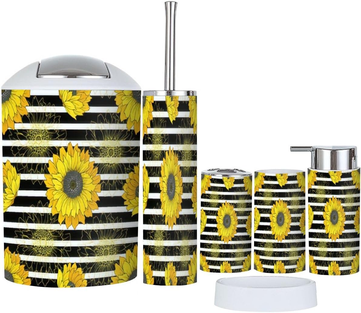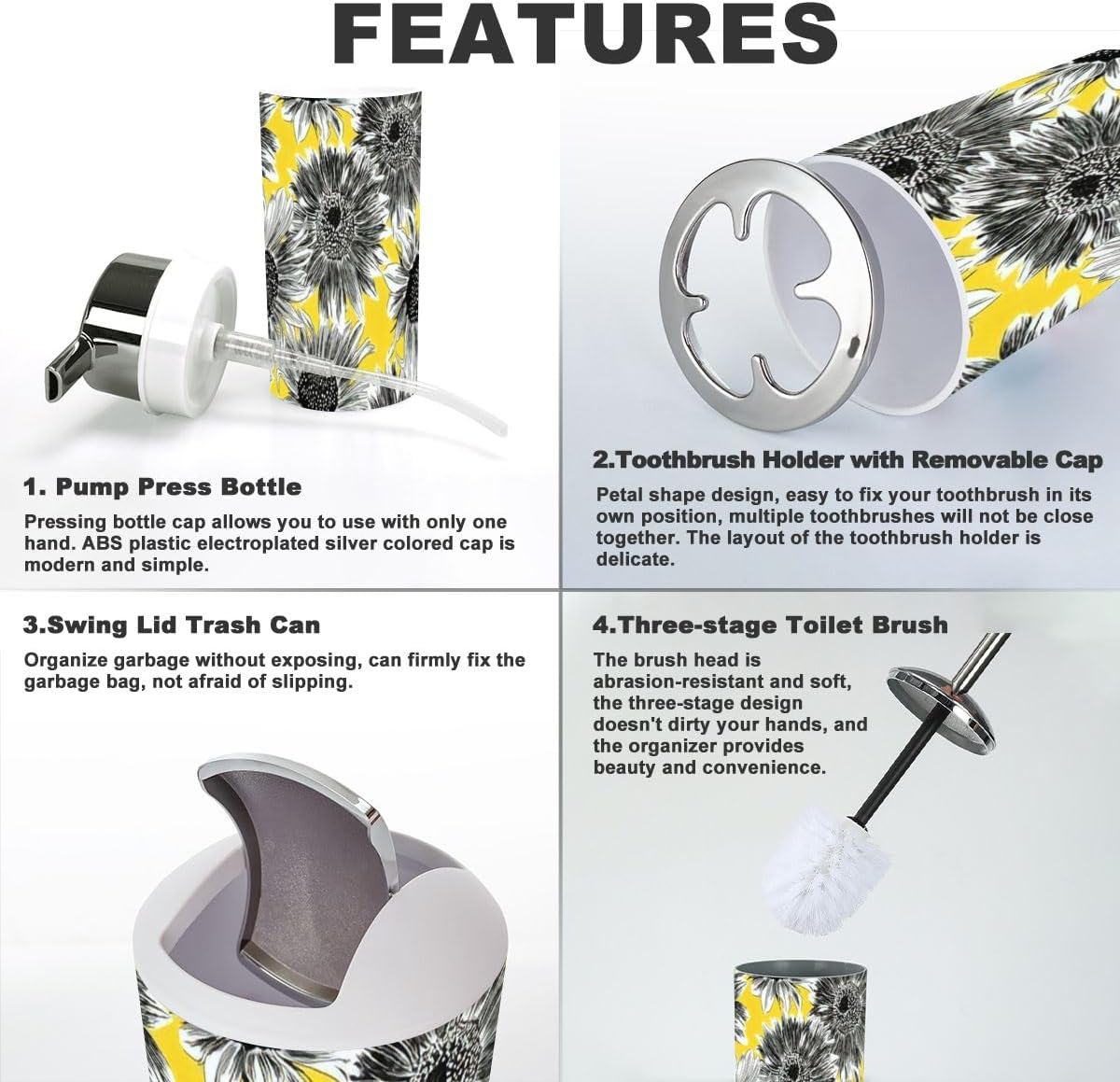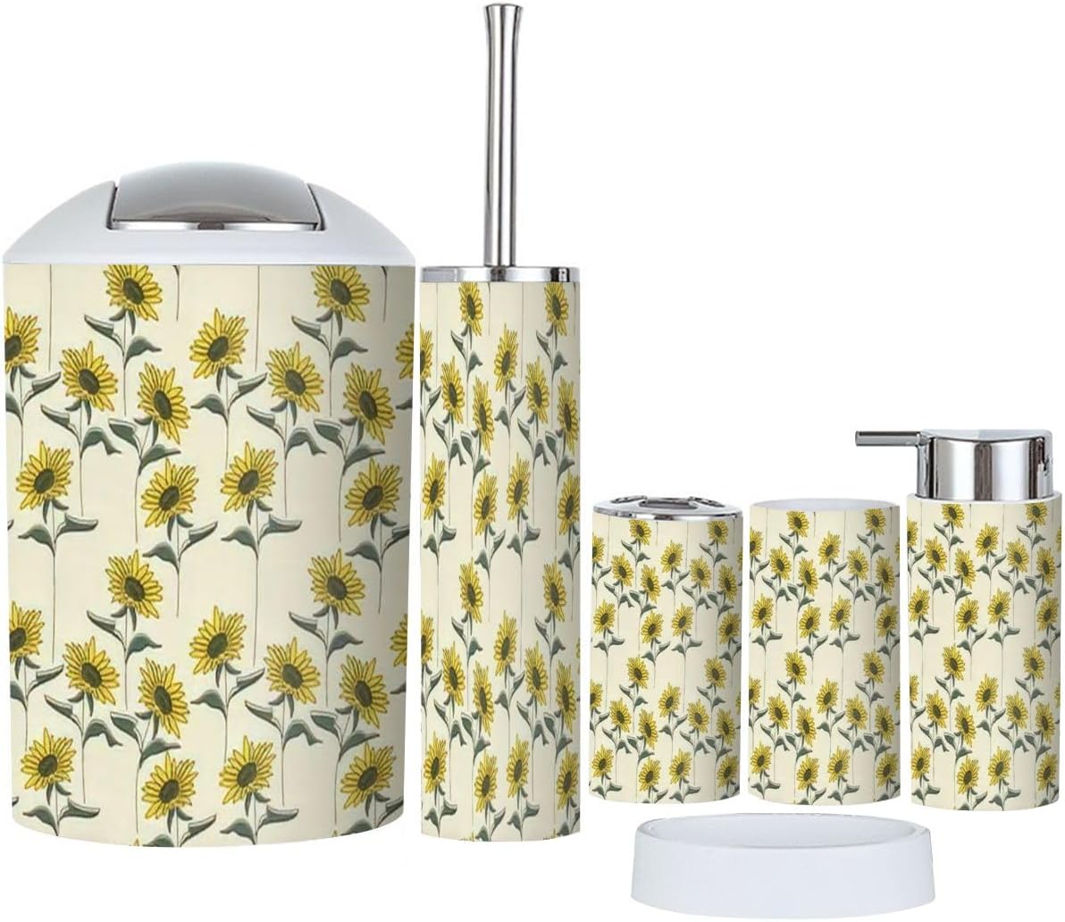 - Lotion DispenserIt can be pressed by one hand and rebound automatically. Use our soap dispenser for liquid hand soap, dish soap, lotion, shampoo, body wash, massage oils, etc.- Toothbrush Cup- Toothbrush HolderFits most sizes of toothbrushes, toothpaste, etc.- Trash CanWith swing lid, it's convenient for using.- Toilet Brush HolderHide the brush head inside the base- Soap DishIt can leak and keep dry.Please Note:1. Please allow tiny size difference for manual measurement.2. Please confirm the size before purchase.