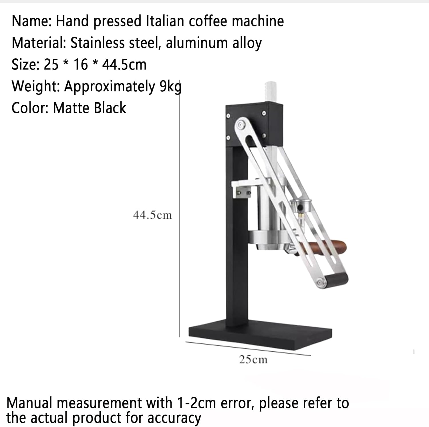 Product specifications: Name: Hand pressed espresso coffee machine Material: Stainless steel, aluminum alloy Size: 25 * 16 * 44.5cm Weight: Approximately 9kg Color: Matte Black packing list: Hand pressed espresso machine*1