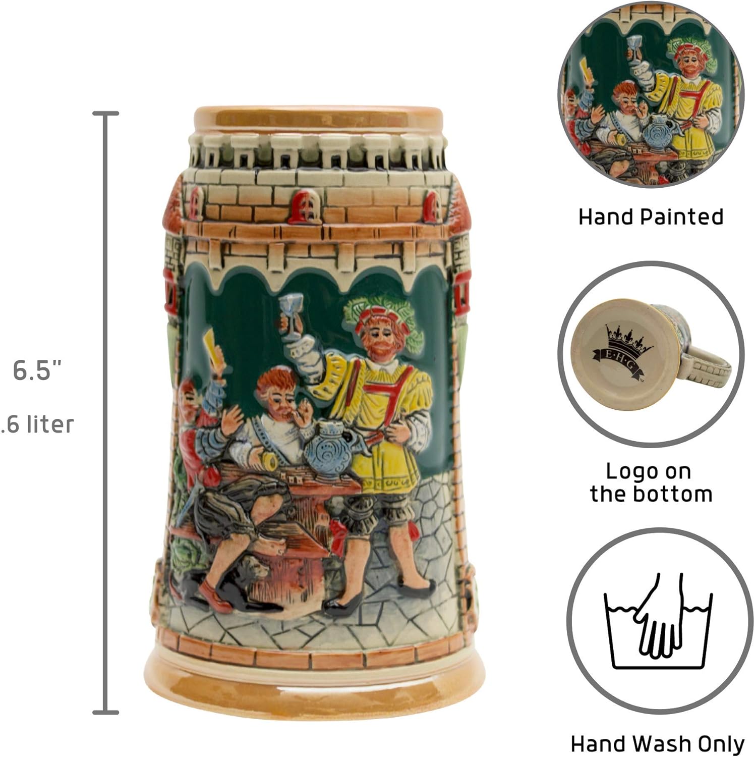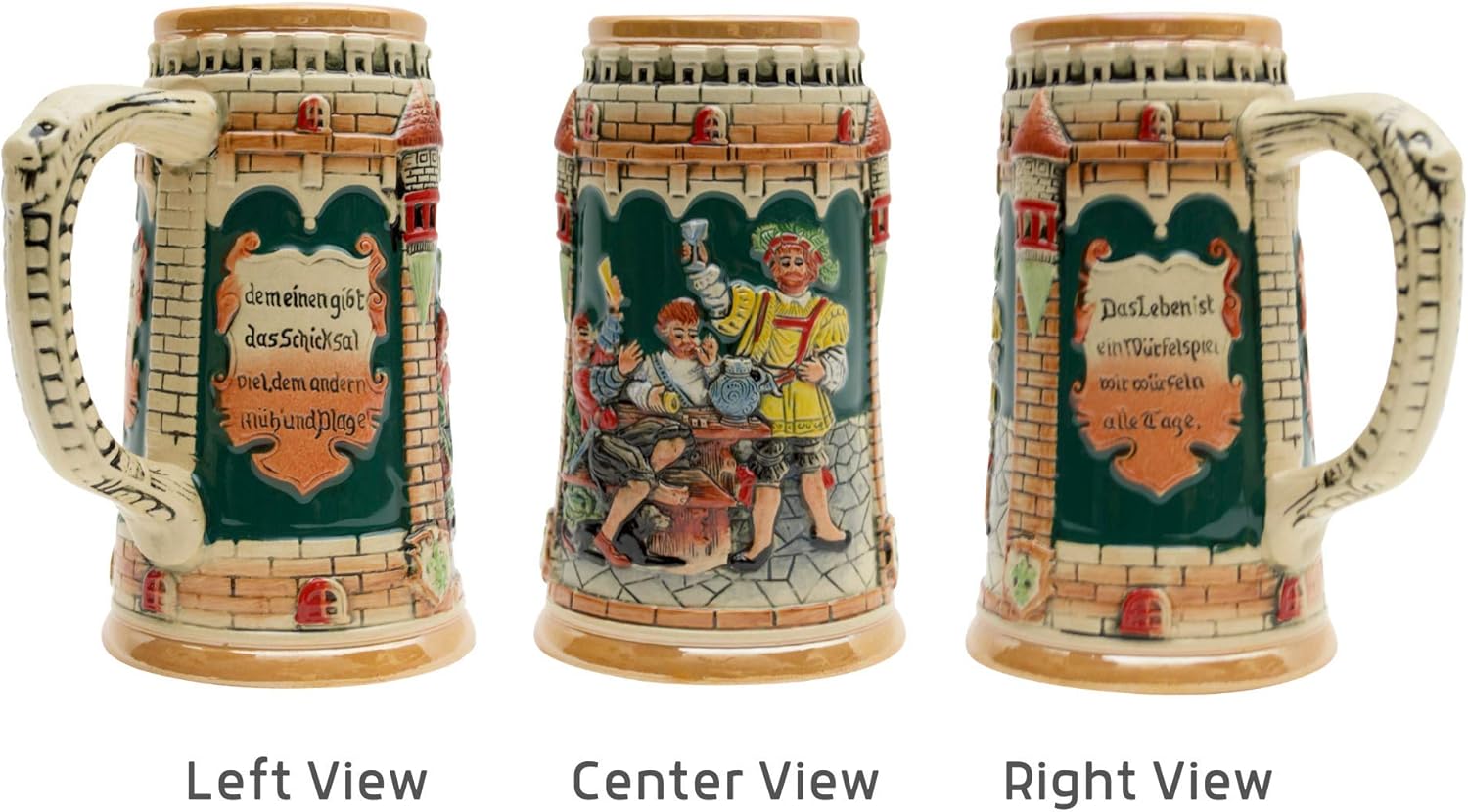 Celebrate Oktoberfest in true Bavarian style with this 0.6-liter German beer stein from Oktoberfest Haus. Crafted from ceramic, it showcases Saying Das Leben Ist Ein Wurfelspiel Wir Wurfeln All Tage, along with a colorful Oktoberfest in München scene.this beer mug is a standout piece for collectors and beer lovers alike. Measuring approximately 5 X 7 X 6.5 Inches, it holds up to 0.6 liters of your favorite brew or beverage. This stein beautifully blends traditional German craftsmanship with festive flair, making it a timeless treasure for any occasion. Whether you're gifting a beer enthusiast, celebrating a birthday, or adding to your stein collection, this decorative piece brings authentic charm to any setting. Perfect for Father’s Day, Oktoberfest parties, or simply enjoying a cold drink in style, this German beer stein is a must-have for those who appreciate culture, craftsmanship, and great beer. This German beer mug Features famous castles & cities with a vibrant Oktoberfest München scene.
