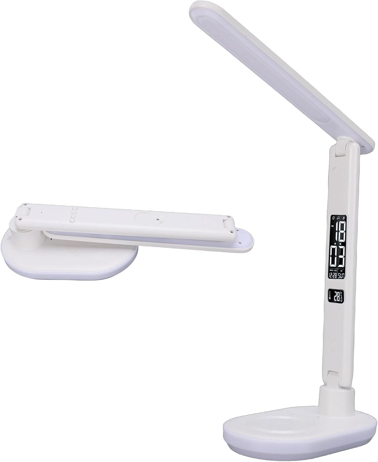 1. Dual Charging Modes: This LED desk lamp features a 10W wireless charging function and a USB charging capability, allowing you to power multiple devices at once for convenience. 2. Adjustable Brightness and Color Temperature: The desk lamp offers five brightness levels and three color temperatures, providing bright, warm, and soft lighting that's easy on the eyes. 3. Dynamic RGB Lighting: The foldable lamp includes vibrant RGB dynamic lights to create lively and vivid ambiances, catering to various needs like working, studying, or relaxing. 4. Alarm Clock with Snooze: Featuring an alarm clock with a "snooze" function, you can enjoy extra sleep from 5 to 60 minutes, with easy deactivation within a minute of sounding. 5. Foldable and Touch Control Design: With touch adjustable brightness and modes, the desk lamp has a 180 degree foldable arm and a 90 degree base axis, making it portable and space saving. Specification: Item Type: LED Desk Lamp Material: Plastic Weight: Approx. 900.00g / 31.75oz How to Use: Refer to the instruction manual included and follow the instructions PackageList: 1 x LED Desk Lamp 1 x Data Cable 1 x User Manual