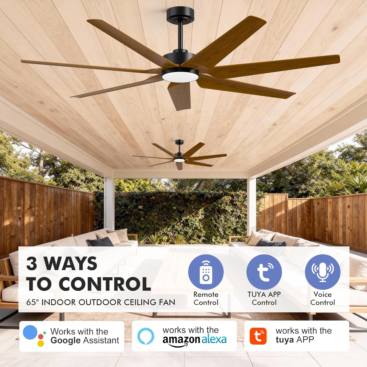 | Special Features | 65" Rustic Outdoor Ceiling Fan with Light, 7 Walnut-Finished ABS Propeller Blades (7954cfm). Ultra-Quiet <35db, Reversible Dc Motor (75% Energy Saving);, Damp-Rated Outdoor Fan for Indoor Outdoor, for Covered Patios, Gazebos, Porches, and Garage;, ETL/FCC Certified Quality. Flush or Angled Mount Low-Profile Ceiling Fan: 3 Downrods (6"/12"/24") & up to 20° Angled Mount, Fully Dimmable Ceiling Fan with Light, Flicker-Free 24W LED, 3-Color Temp (3000-5000K), 10-100% Dimmable with Memory;, Smart Ceiling Fan with Voice Control via Alexa/Google, Tuya App & Remote Control. 6 Speeds, 1/4/8H Timer; |