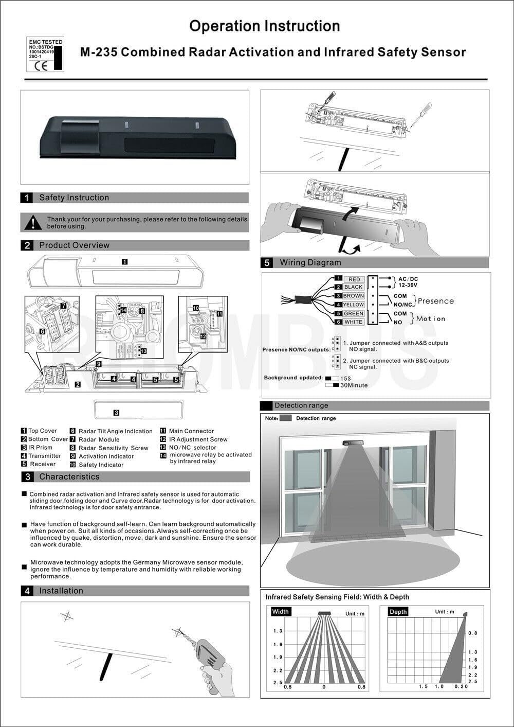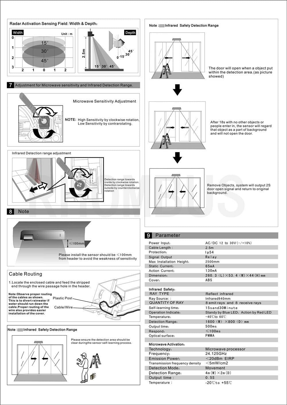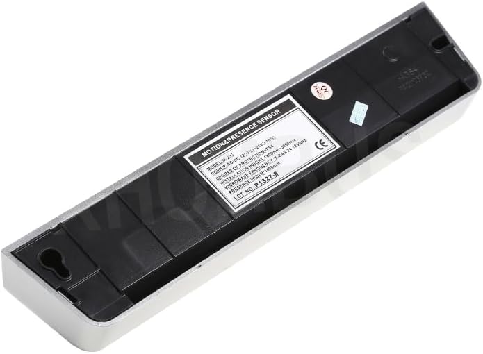 Parameter: Power supply: AC/DC12-30V Cable Lenght: 2.5m Signal Output: Relay Max. installation Height: 2500mm Static Power: 65mA Action Current: 130mA Dimension: 260.3Lx53.4Wx44Hmm Cover: ABS Infrared Safety: Ray Type: Reflect infrared Ray Source: Infrared940mm Quantity of Ray: 8 emit rays and 8 receive rays Self-learing time: 10s Operation Indicate: Standby by Blue LED, action by Red LEd Temperature: -40~60C Output time: 500ms Respond: Less than 100ms Optical surface: PMMA Microwave Activation: Technology: Microwave processor Frequency: 24.125GHz Emission Power: <20dBm EIRP Transmission Frequency density: <5mW/cm2 Detection Mode: Movement Detecton Range: 4m(W)x2m(D) Output time: 0.5s Temperature: -20~55C Package:1pcs