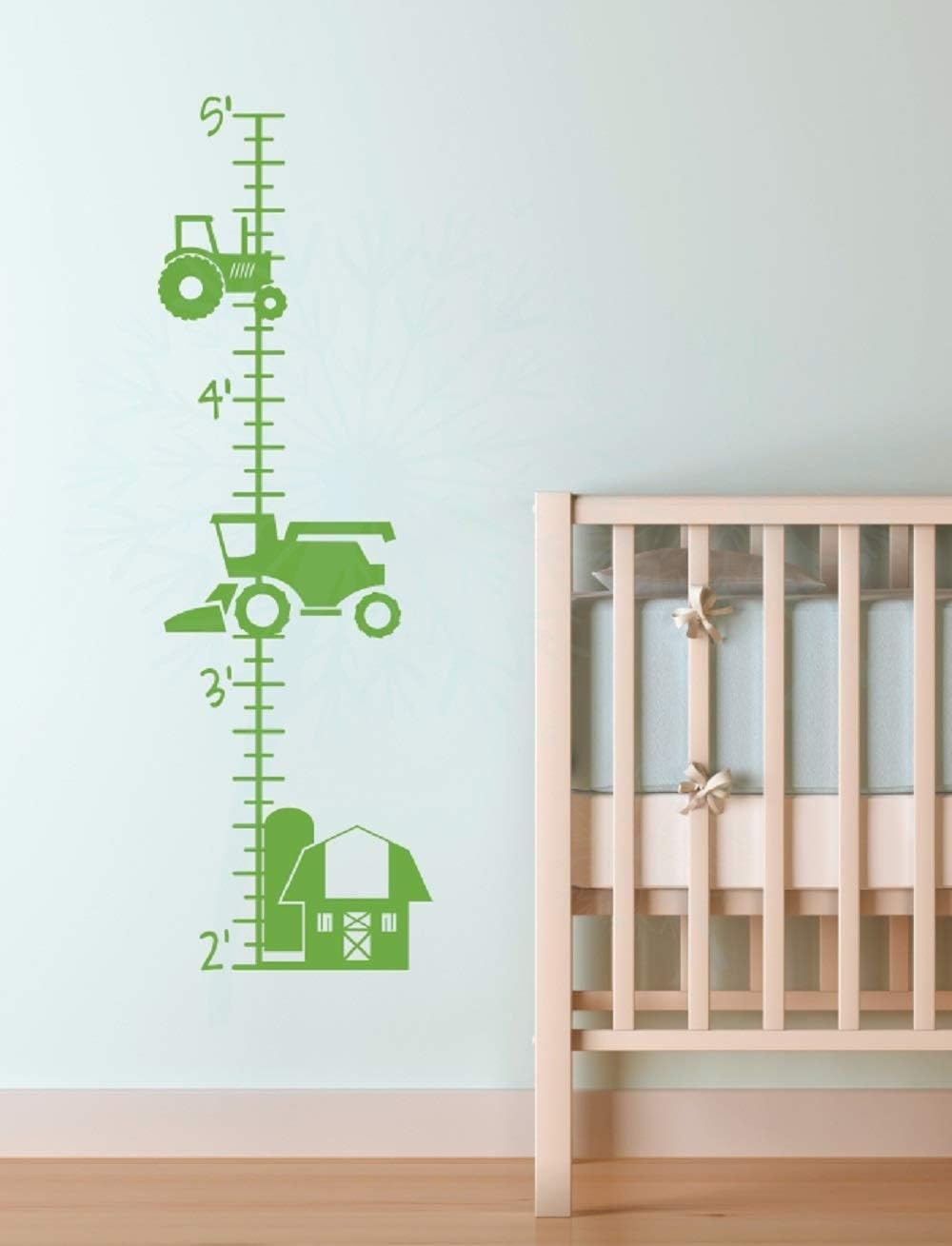 Farm Tractor Barn Growth Chart - Track the Growth of your Children using this Farming Vinyl Decal Growth Chart Sticker. Wall Decor Plus More offers QUALITY Vinyl Wall Decals MADE IN USA. Each wall decal is cut on a cutter, the excess vinyl material is removed by hand then transfer tape is applied. No outsourcing here, the FULL PROCESS is done in the USA. These are die-cut decals. Die-cut decals do NOT have a background material like printed stickers do. Your wall or surface will be visible through and around the openings of your design. Each vinyl wall decal is premised and packaged with detailed application instructions included. No individual letter or word alignment/installation is needed. Made from the best quality, customer-requested, matte, removable vinyl material - this matte finish makes each decal looks "painted" on. Our wall decals are designed for Home Decor surfaces, are easily removable but they are not reusable. We are a small US based (South Dakota) company and we offer a quality product at a fair price and stand behind it. Have questions? Simply call us, we will be happy to help.