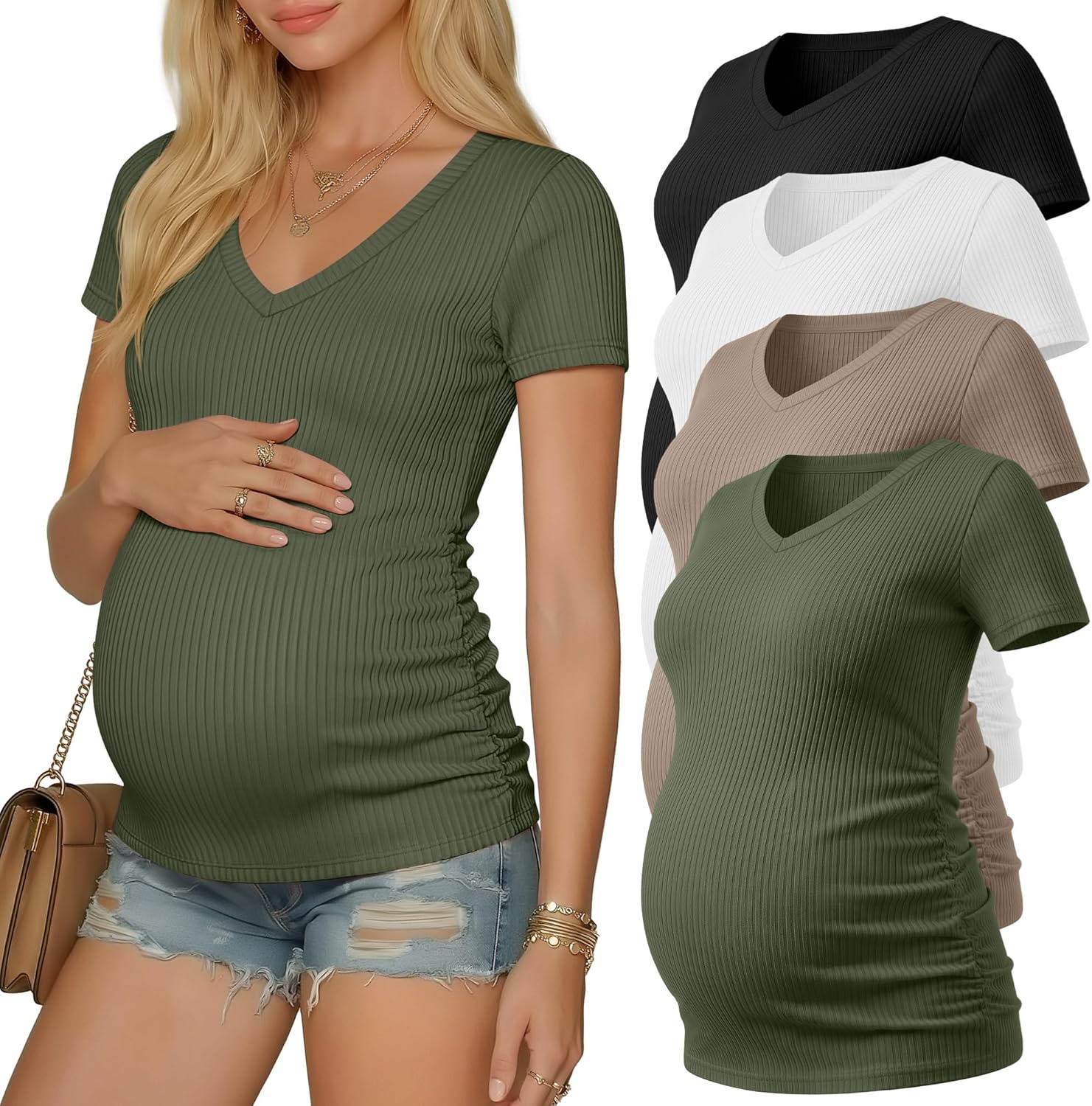 Features: Comfortable cotton fabric is gentle on the skin and breathable, allowing you to stay relaxed, comfortable, and dry even in the hot summer. Ideal maternity t-shirt for mom-to-be. With soft stretchy fabric and sides ruched design, these maternity tops offer a flexible fit at each stage of pregnancy, with enough length to cover your bump. Material: 92% Cotton, 8% Spandex Package Includes: 4 x Women's Maternity Shirts Notes: Manual measurement, please allow slight errors on size. The color may exist a slight difference due to different screen display.