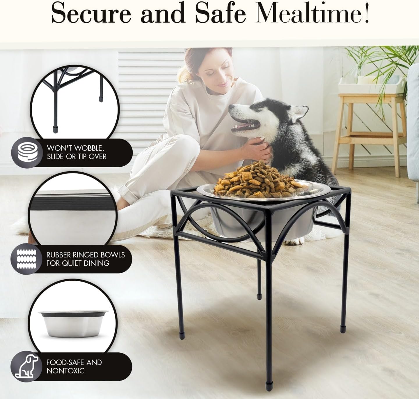 Introducing the Regal Single Bowl Elevated Dog Feeder by NMN Designs – a fusion of style, practicality, and pet-friendly design. Crafted with precision, this elegant wrought iron dog bowl stand elevates your pet's dining experience to a whole new level. With its sophisticated black finish, the Regal Single Bowl seamlessly blends into any home decor, whether modern or traditional. The use of high-grade wrought iron ensures durability and longevity, making it a sound investment for pet owners. But it's not just about aesthetics; this elevated dog feeder promotes your pet's well-being. It reduces neck strain, encourages better posture, and aids in improved digestion. Plus, with rubber tips on its legs and a rubber rim around the bowl, it provides a noise-free and stable dining experience. You can choose from various stainless steel bowl options, including slow feed bowls, to cater to your pet's specific dining preferences. Available in three sizes, this feeder suits small, medium, and large dog breeds. Optional accessories like a set of stainless steel bowls or a slow feed bowl for larger breeds allow you to customize your pet's dining setup. Elevate mealtime for your furry friend with the Regal Single Bowl Elevated Dog Feeder – where style meets substance, and your pet's well-being takes center stage. Trust NMN Designs for quality, durability, and thoughtful design that both you and your four-legged companion will appreciate.