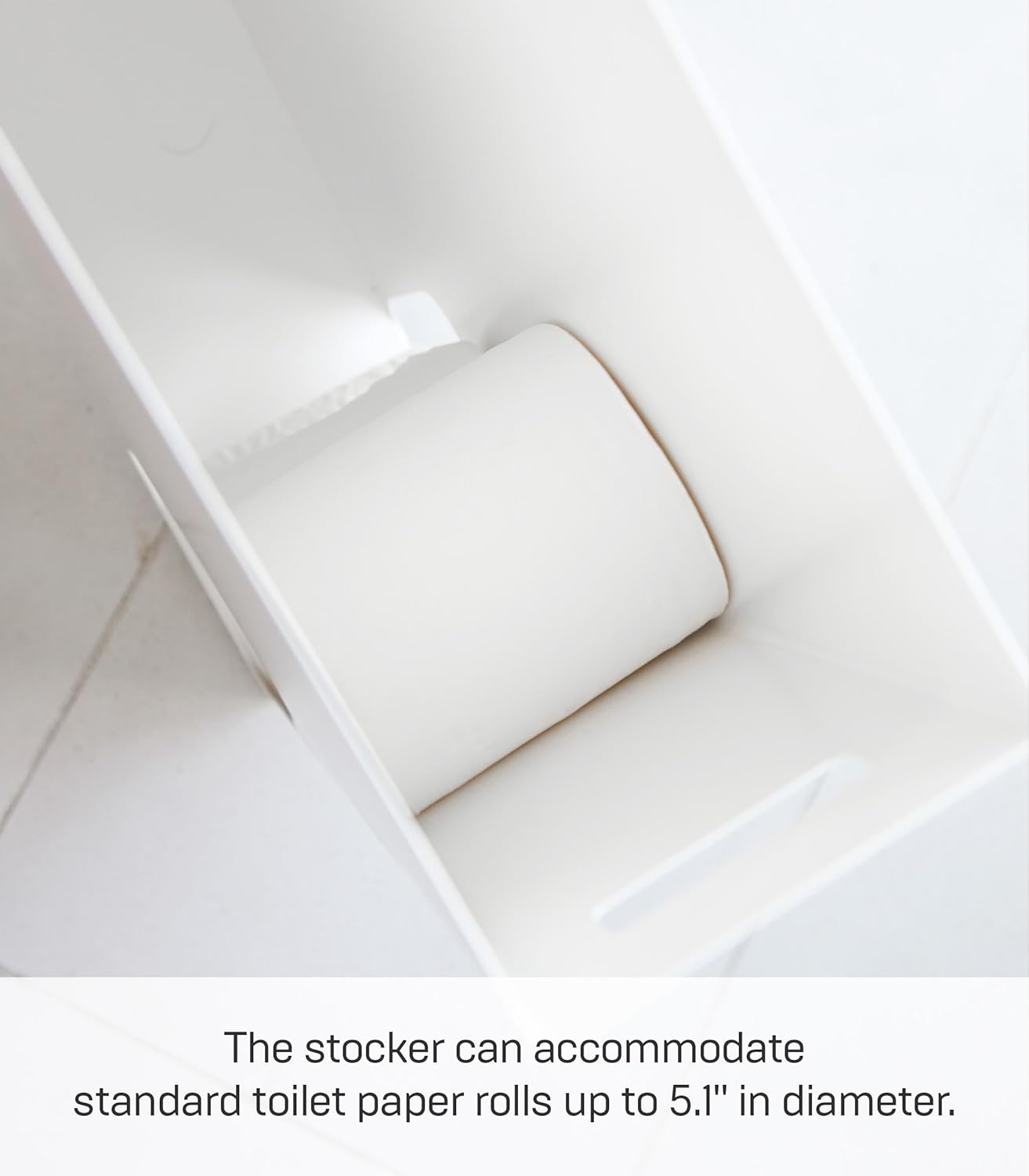 Keep extra toilet paper close at hand but out of sight with this sleek holder. Holds 12 rolls of toilet paper, cutting down trips to the supplies cupboard! A sloped interior automatically dispenses the next roll as each one is used. The slim design tucks easily into tight spaces, and has a recessed top for stowing small items.